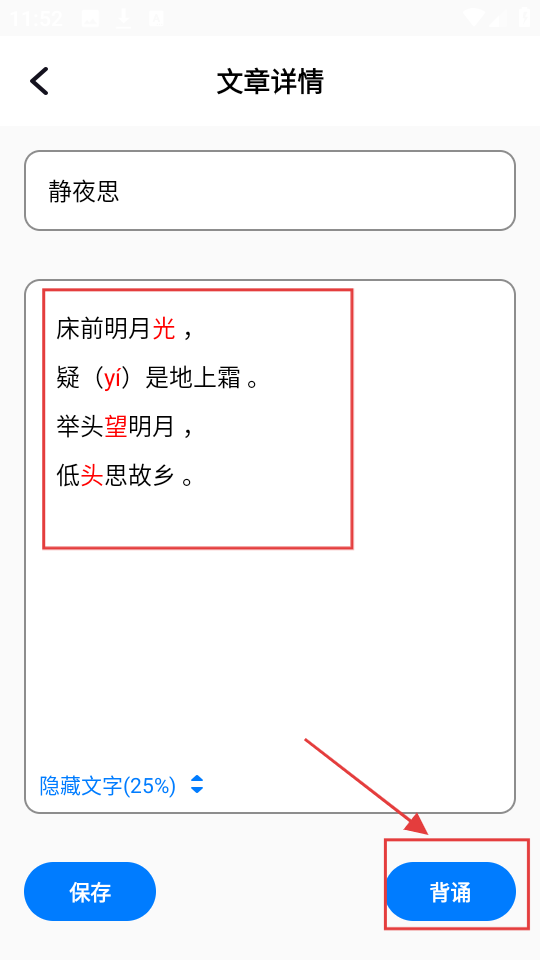 3、进入《静夜思》详情页,可看诗词内容,点【背诵】,进入背诵选择界面,选背诵方式。