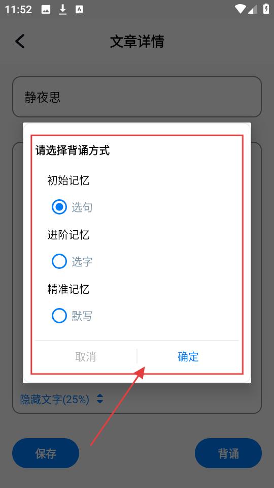 4、进入背诵方式选择界面,有初始记忆选句、进阶记忆选字等方式,选合适方式,点【确定】背诵。
