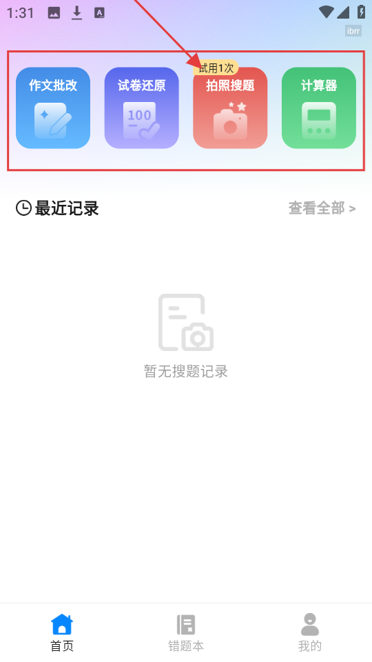 1、进入首页,有【作文批改】【试卷还原】等功能,选【拍照搜题】,可试用该功能搜题。