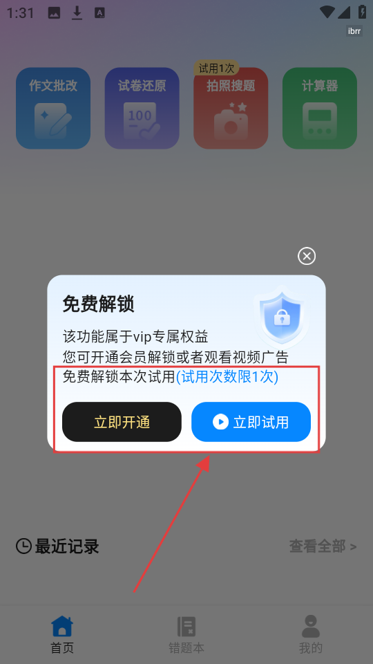 2、若【拍照搜题】需VIP,可点【立即试用】,免费解锁本次试用,体验搜题功能。