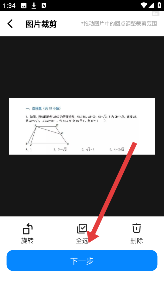 3、进入图片裁剪页,可旋转、全选题目图片,调整裁剪范围后,点【下一步】,进行搜题。