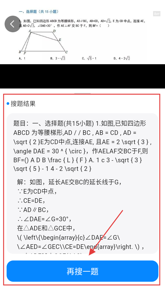 4、查看搜题结果,若需搜更多题,点【再搜一题】,继续使用拍照搜题功能,获取题目解析。