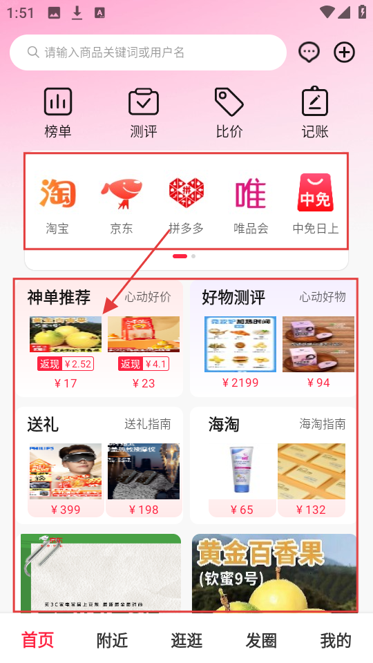 1、进入首页,有【榜单】【测评】等功能,还有淘宝、京东等平台入口,选【神单推荐】,查看优惠商品。