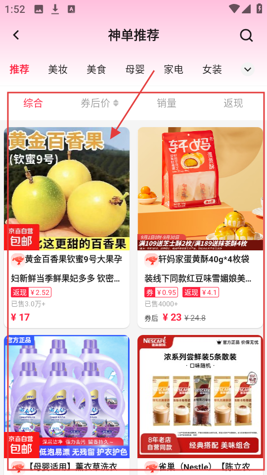 2、进入神单推荐页,有美妆、美食等分类,选感兴趣分类,浏览商品,如黄金百香果、轩妈家蛋黄酥等。
