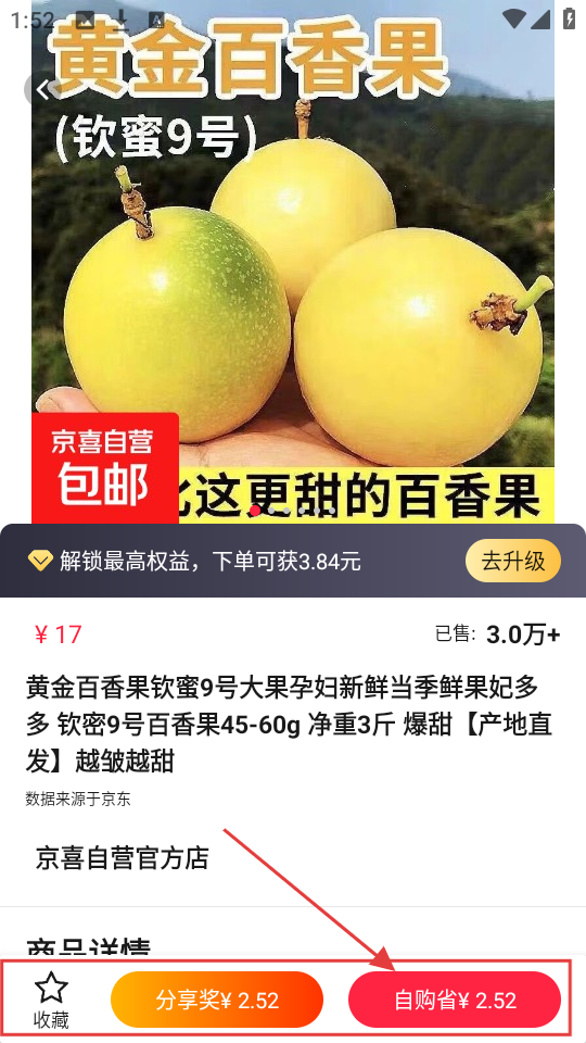 3、在黄金百香果商品页,可看价格、销量等,点【自购省¥2.52】,享受优惠,完成商品购买。