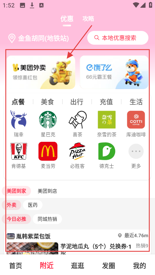 4、切换至附近页,有点餐、美食等分类,还有美团外卖、饿了么入口,选心仪商家,如瑞幸、星巴克等,下单消费。