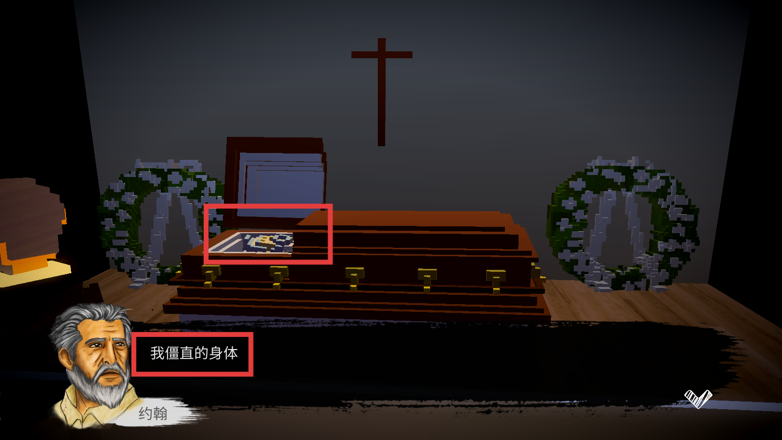 4、在棺材场景中,留意棺材内的物品,结合角色约翰的【我僵直的身体】台词,分析线索推进解谜。
