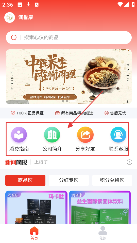 1、进入润誉康首页,有【消费指南】【公司简介】等功能入口,可先看消费指南,了解购物规则再选商品。