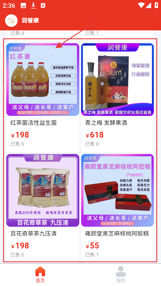 2、在商品区,有红茶菌、发酵果酒等商品,选感兴趣的【红茶菌】,进入商品详情页查看信息。