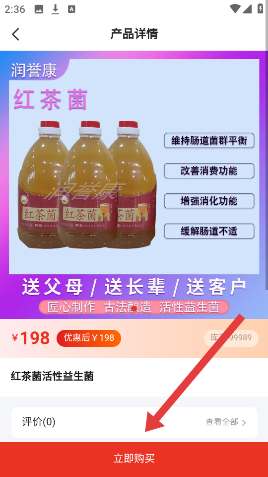 3、进入红茶菌详情页,可看价格、功效等,若想购买,点【立即购买】,进入下单流程。