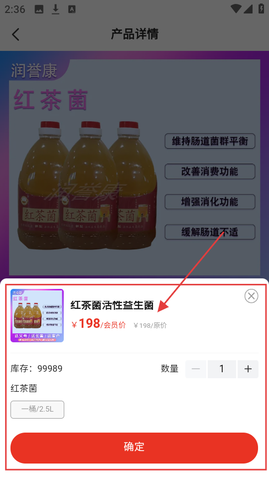 4、在下单弹窗,确认红茶菌价格、库存,选购买数量,点【确定】,完成订单提交,等待收货。