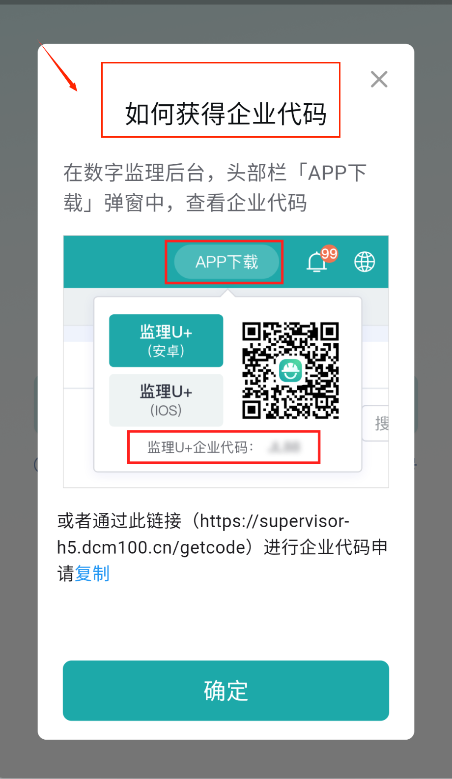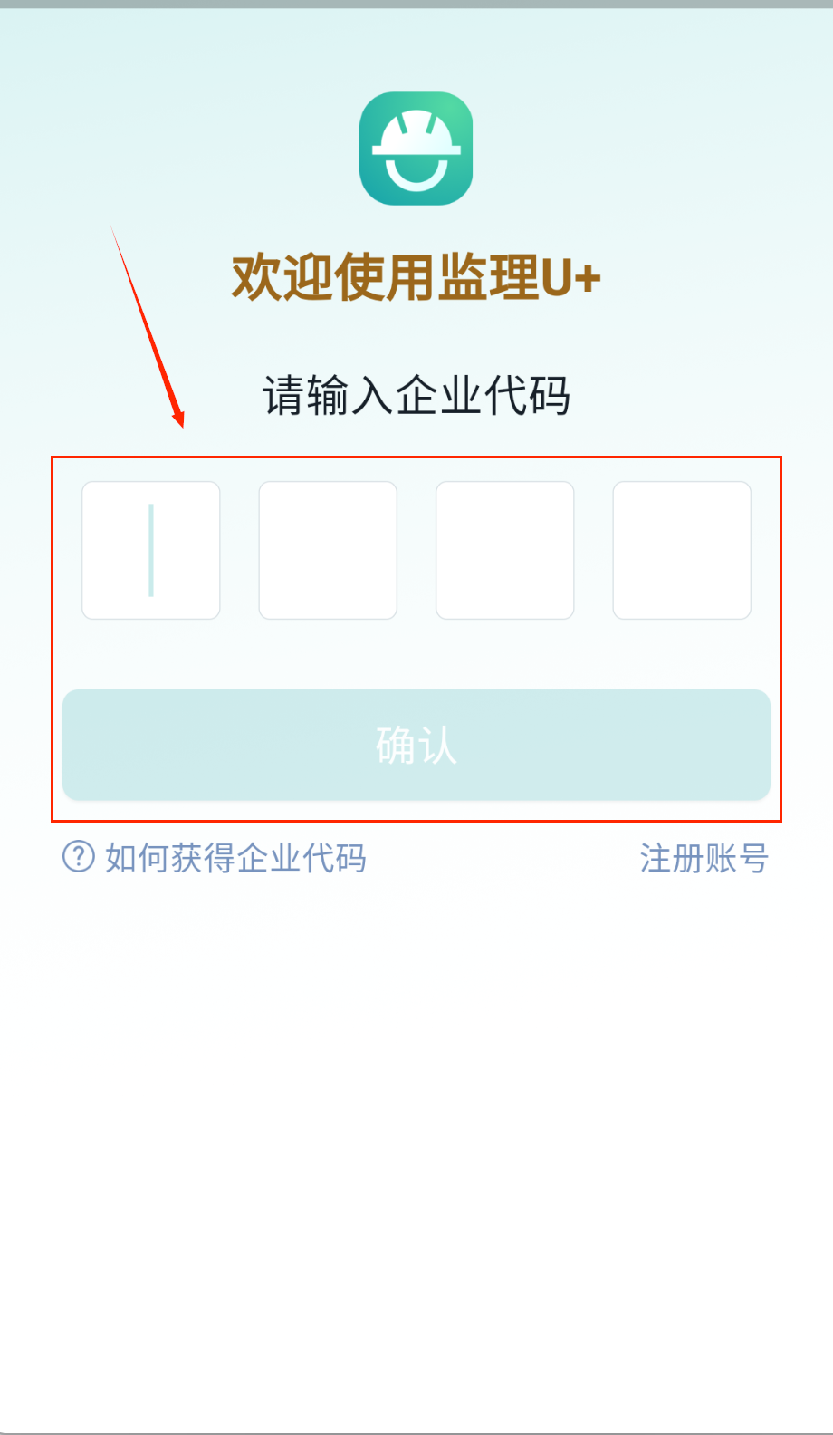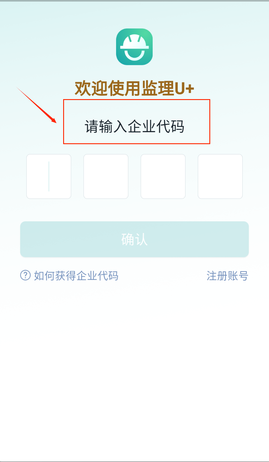 1、打开软件后首先会看到欢迎界面,在请输入企业代码的四个方框里输入正确的企业代码,这个代码可以从数字监理后台的下载弹窗中找到哦。