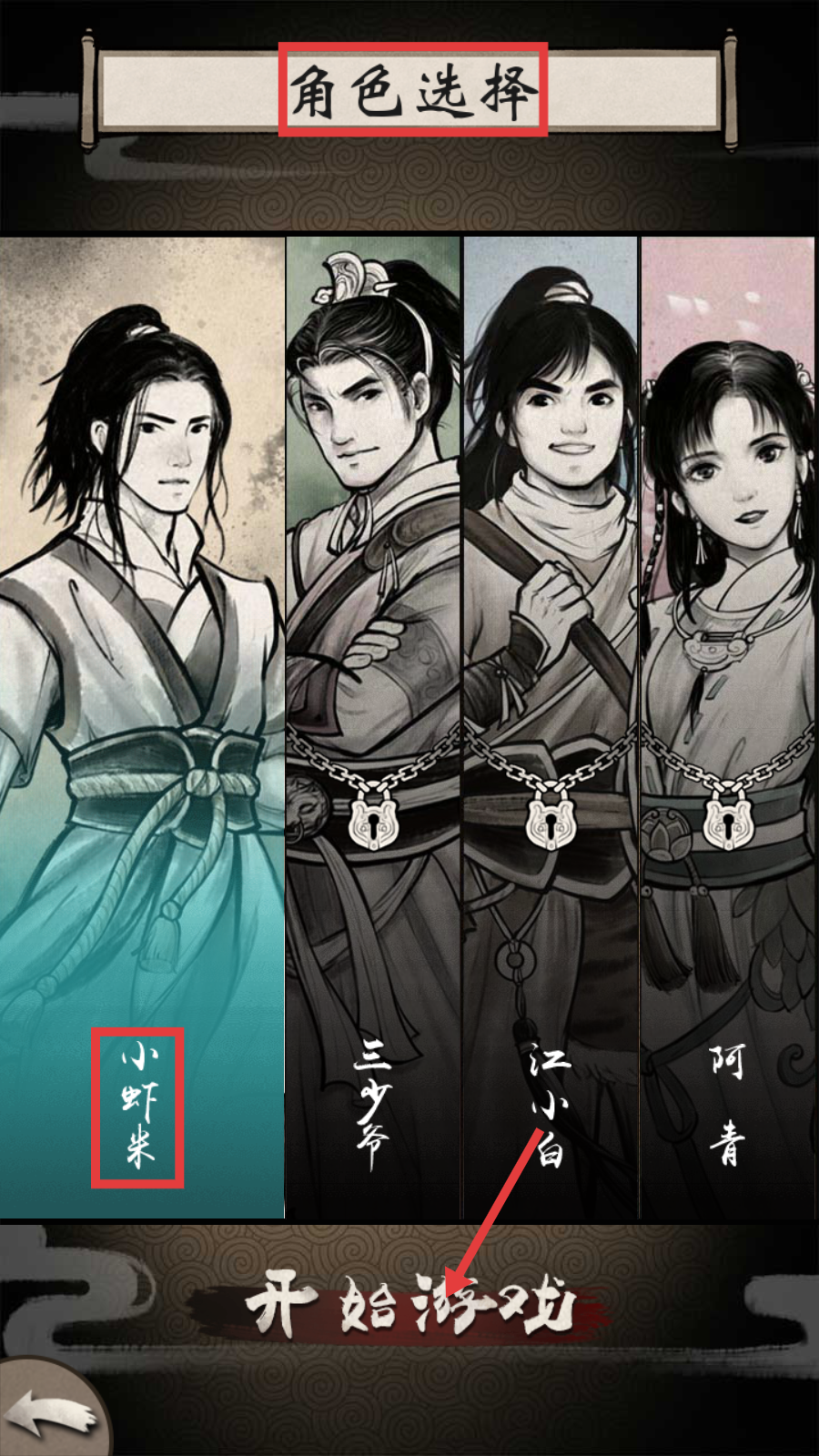 1、在【角色选择】界面选【小虾米】,点击【开始游戏】,开启古风生存冒险。