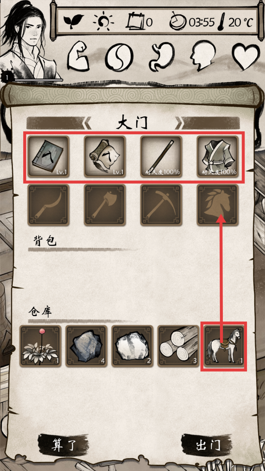 2、进入背包界面,将仓库里的马移到【大门】栏,准备好出行工具,以便高效探索。
