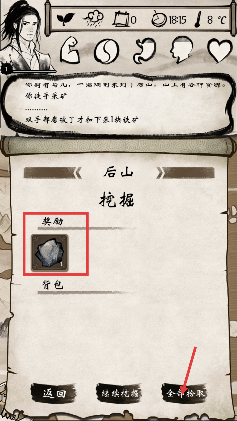 4、挖掘完成后,点击【全部拾取】,将获得的铁矿收入背包,为后续crafting做准备。