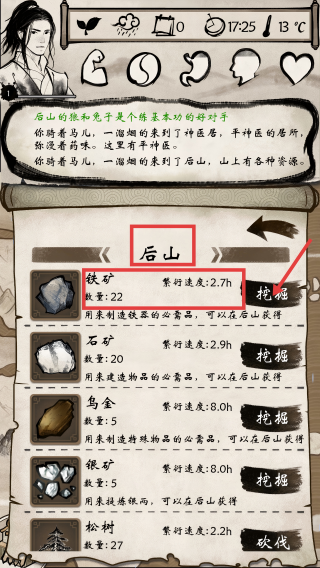 3、前往【后山】,找到【铁矿】,点击【挖掘】,获取制造铁器的必需资源。