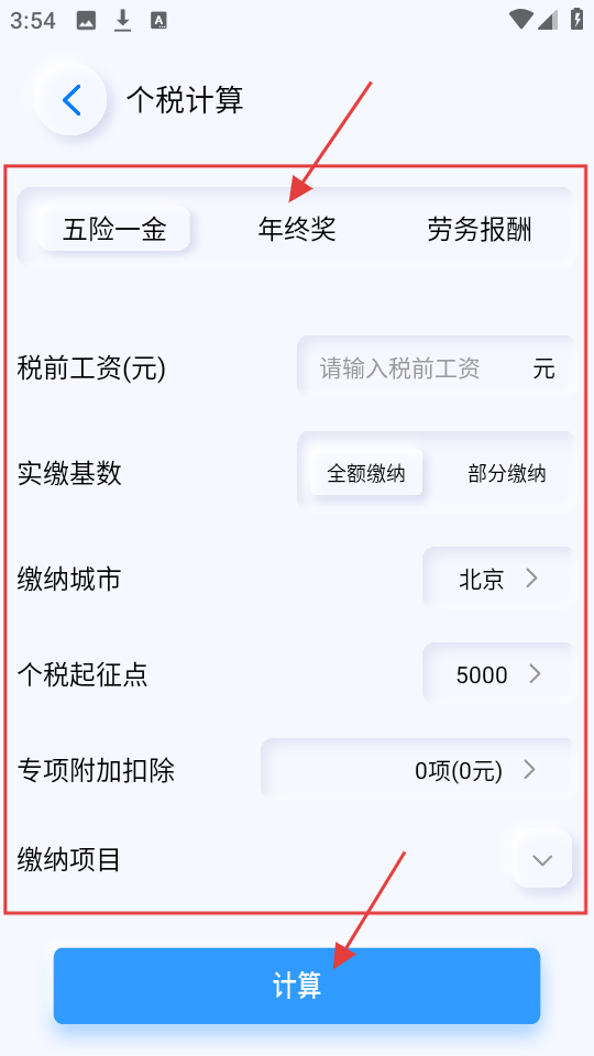 3、选【个税计算】功能,输入税前工资等信息,选缴纳城市、个税起征点等,点【计算】,算出个税。