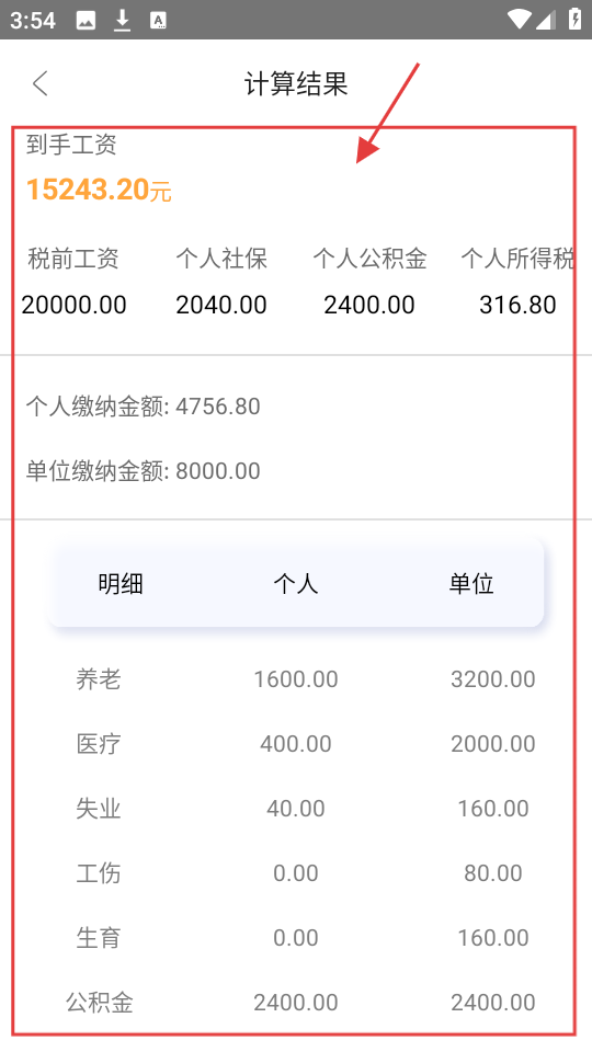 4、计算完成后,会显示到手工资、各项缴纳金额等明细,可清晰查看个人和单位的社保、公积金等缴纳情况。