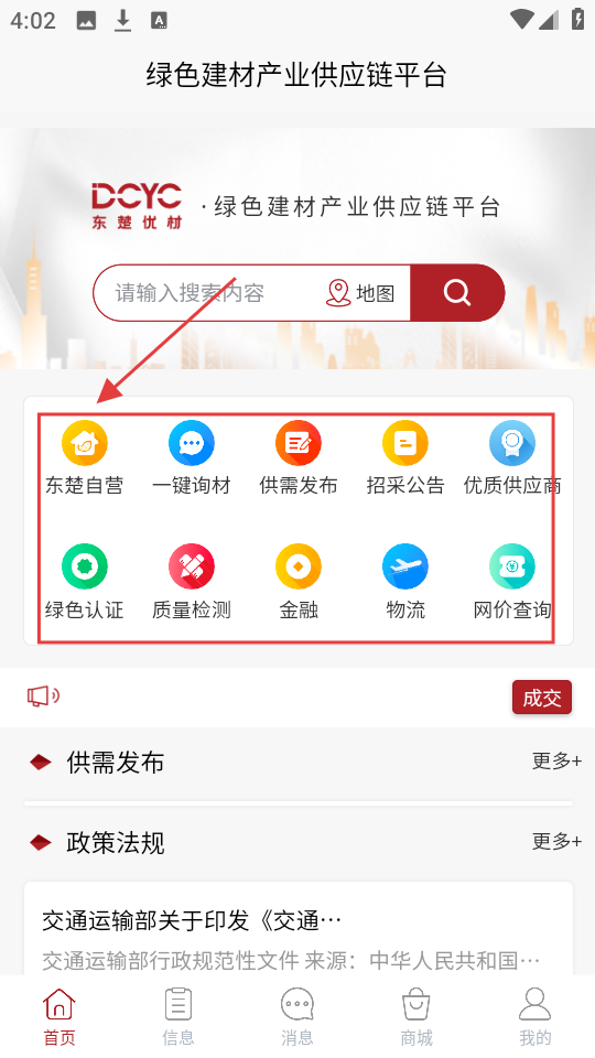 1、进入首页,有【东楚自营】【一键询材】等功能,选【东楚自营】,可查看自营建材商品。