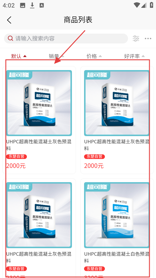 2、在商品列表页,有不同建材商品,可按销量、价格等排序,选心仪的建材商品,进入商品详情页查看信息。