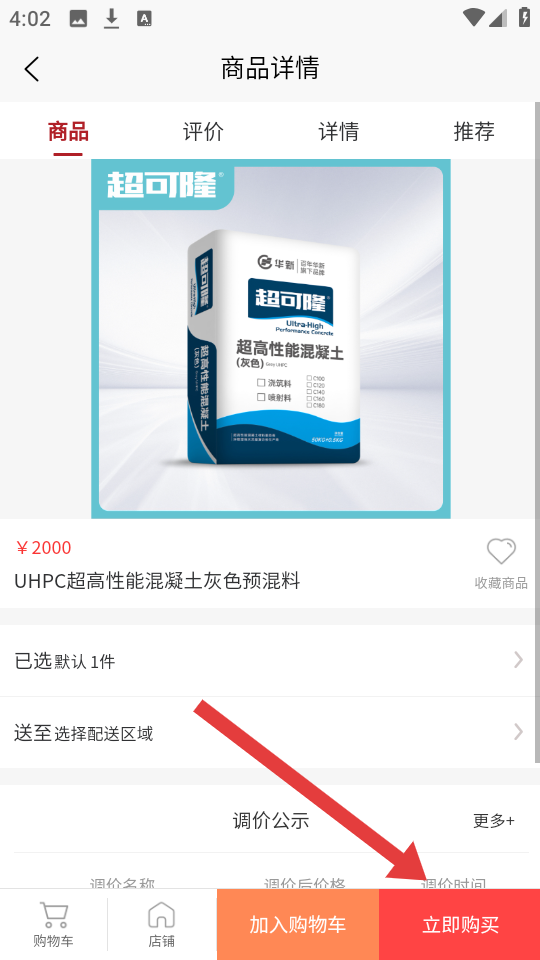3、进入商品详情页,可看建材价格、规格等,选购买数量和配送区域,点【立即购买】,进行下单操作。