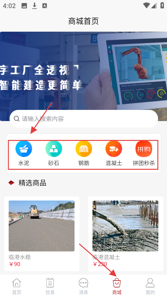 4、还可以点击底部【商城】按钮,有水泥、砂石等建材分类,选需要的建材分类,查看对应商品,也可搜索找特定建材。