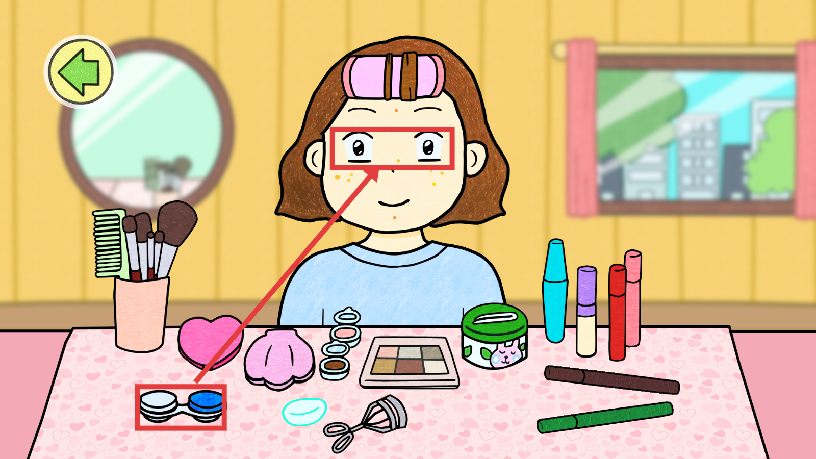 2、首先选取桌上的【隐形眼镜盒】,为夏莉佩戴隐形眼镜,完成眼部的基础装扮步骤。