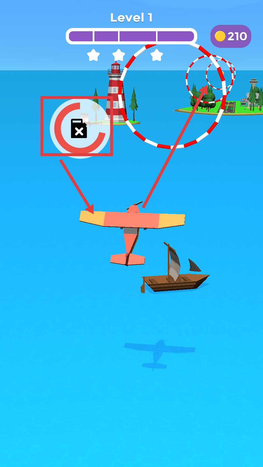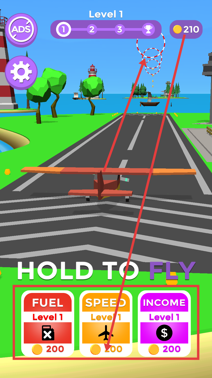 1、开始【Level-1】,先留意【FUEL】【SPEED】【INCOME】属性,按住屏幕让飞机起飞,目标是穿过空中的圆环。