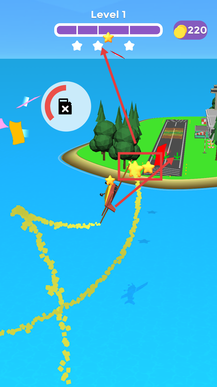 3、飞行中收集黄色星星,同时朝着岛屿上的跑道方向前进,注意燃料剩余情况,为降落做准备。