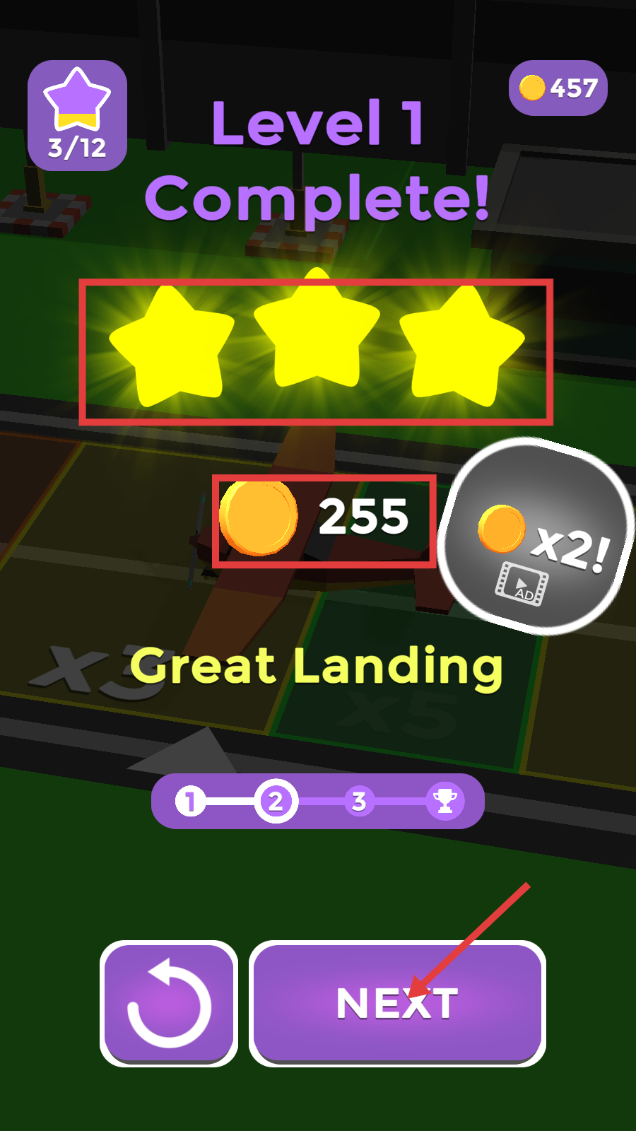 4、成功降落后获得三星评价和255金币,此时可点击【NEXT】按钮进入下一关。