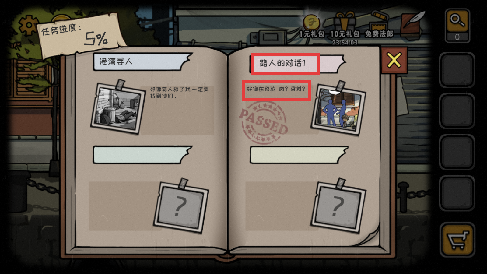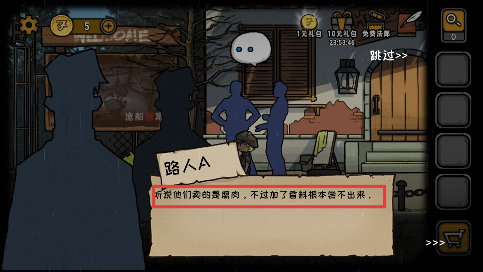 4、留意【路人A】的对话,“听说他们卖的是腐肉,不过加了香料根本尝不出来”,这些对话是重要线索,要仔细记录分析。