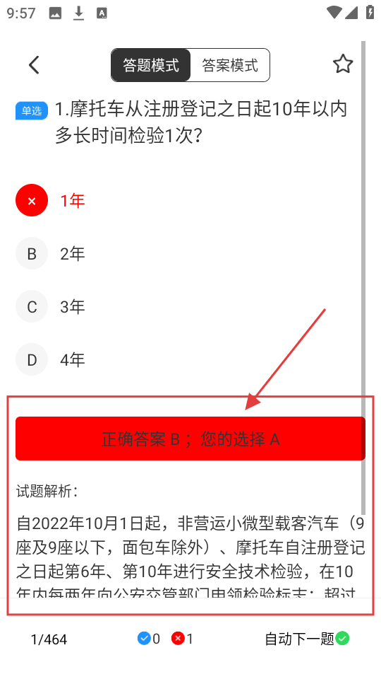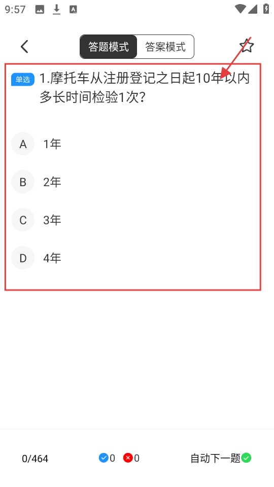 2、在答题页面,认真看题目,如摩托车检验相关题,根据知识选答案,锻炼答题能力。