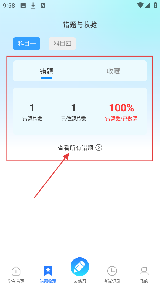 4、进入错题与收藏页,点【查看所有错题】,回顾错题,针对性复习,提升驾考知识掌握程度。