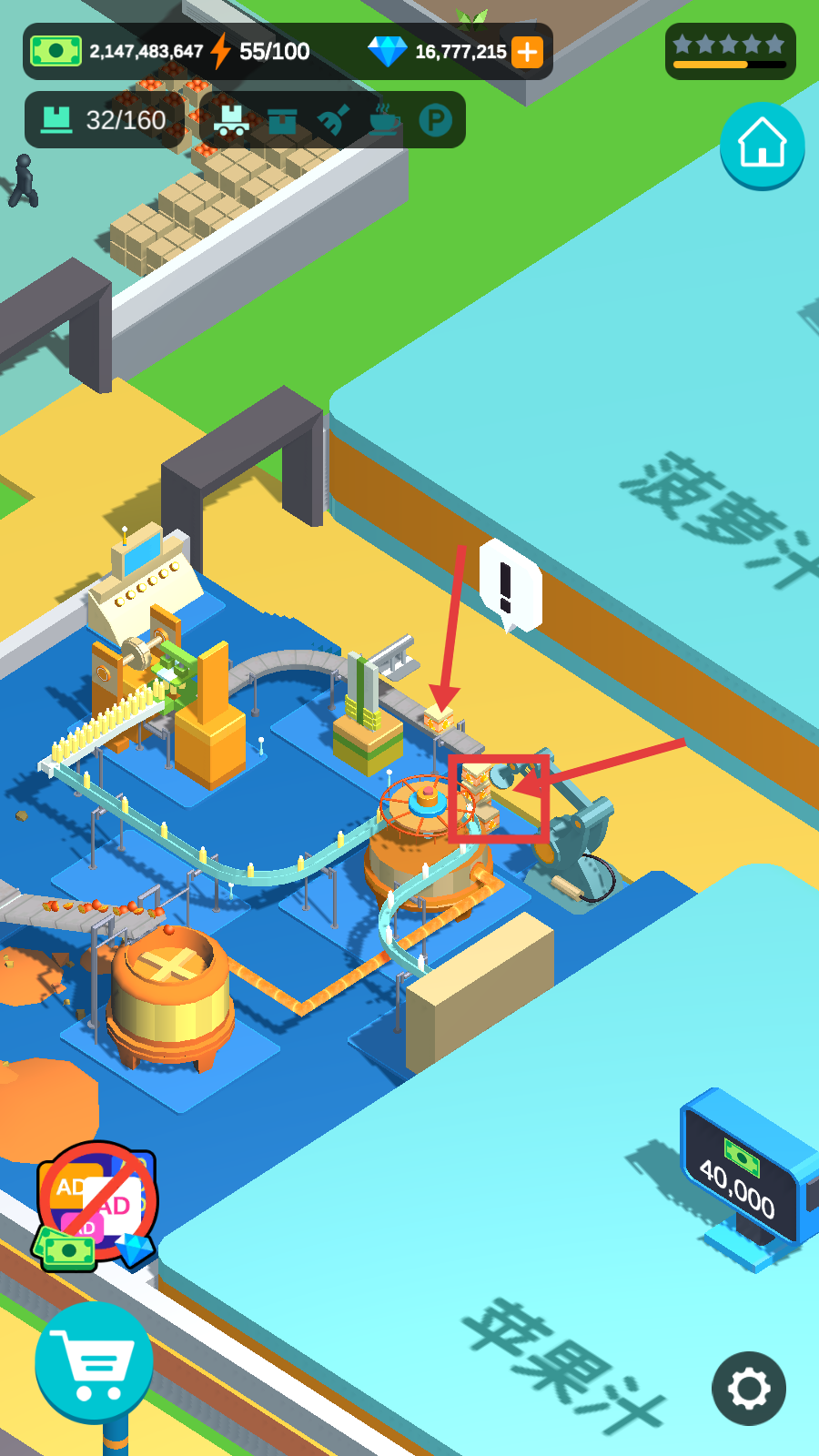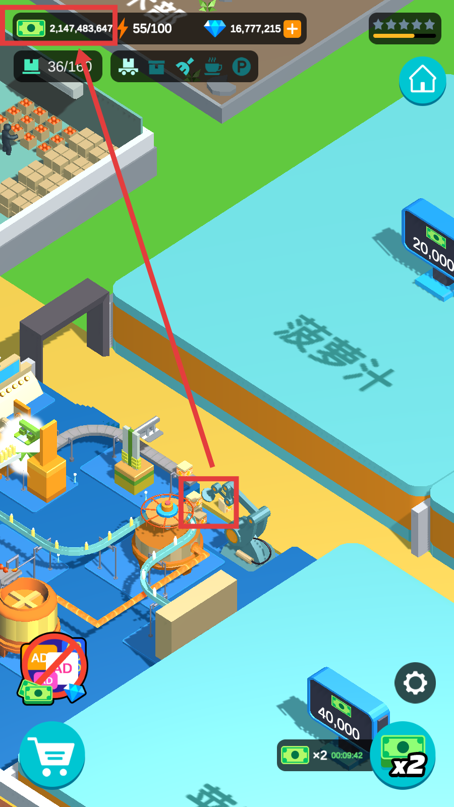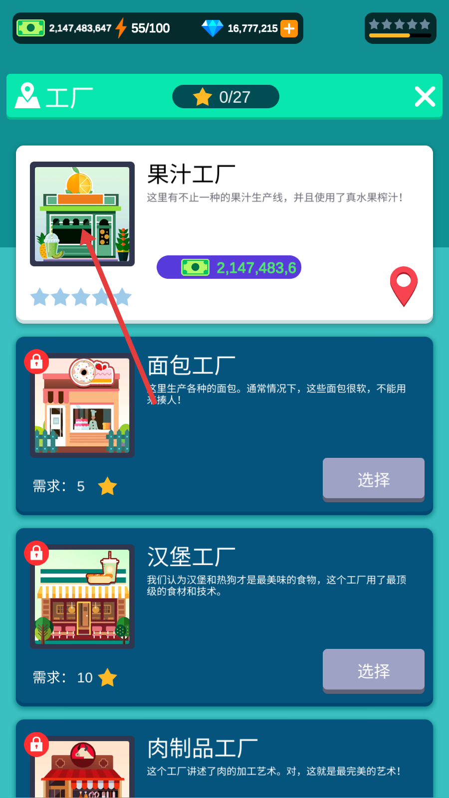 1、先选【果汁工厂】,花费【2,147,483.6】开启,它有多条真水果榨汁生产线,优先解锁开展生产。