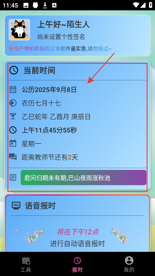 1、进入APP报时页,可看当前时间,含公历、农历等信息,还能知晓距离教师节等节日的天数。