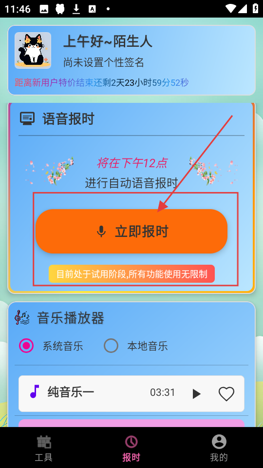 2、在语音报时板块,点击【立即报时】,能即刻获取语音报时,且目前功能试用无限制。