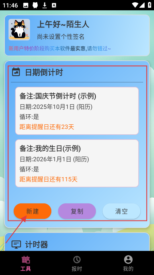 3、切换到工具页,有日期倒计时功能,点【新建】,可添加新的日期倒计时提醒事项。