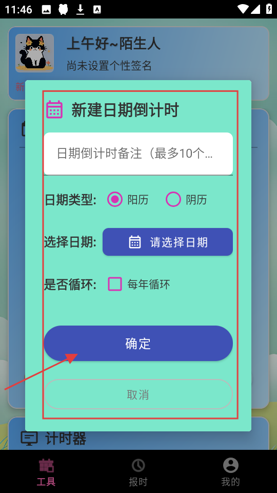 4、在新建日期倒计时弹窗,填备注、选日期类型和日期,设置是否循环,点【确定】,完成新建。