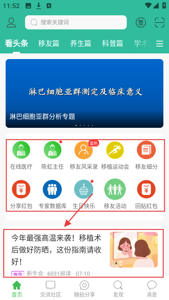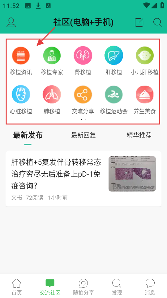 3、切换到交流社区页,有【移植资讯】【肾移植】等分类,选对应分类,获取相关领域信息。