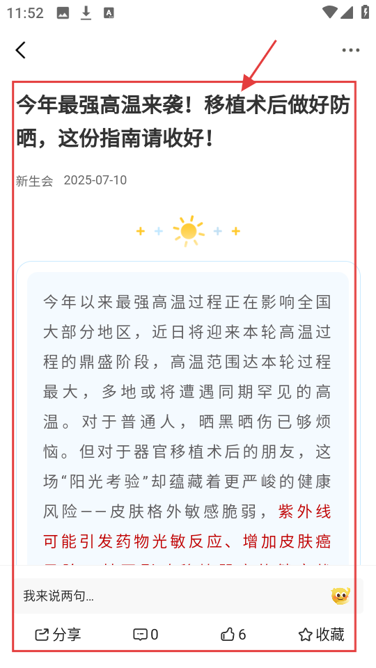 2、点开高温防晒指南文章,能阅读详细内容,了解移植术后防晒要点,还可参与互动交流。