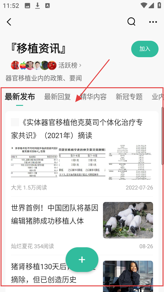 4、进入移植资讯板块,可看最新发布的资讯内容,点【加入】,能参与资讯相关的交流讨论。