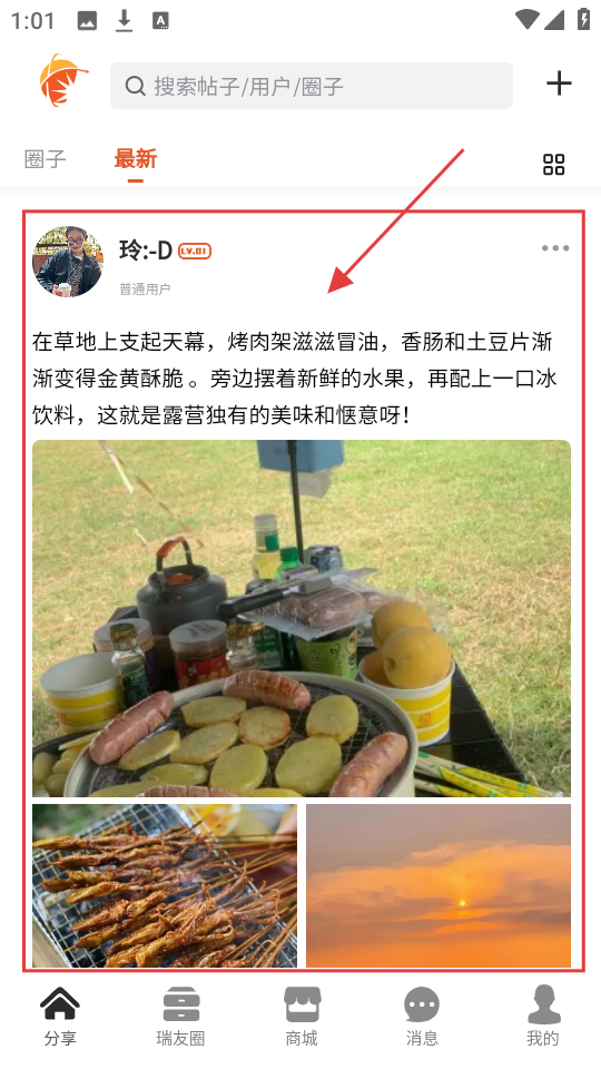 1、进入APP,看用户分享的露营帖,了解露营美食等内容,感受露营乐趣。
