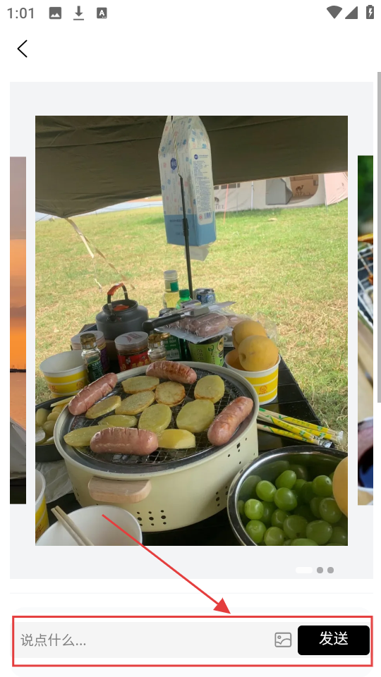 2、点开露营帖图片,可放大查看细节,在输入框写评论,点【发送】,参与帖子互动。