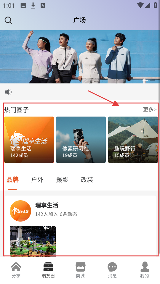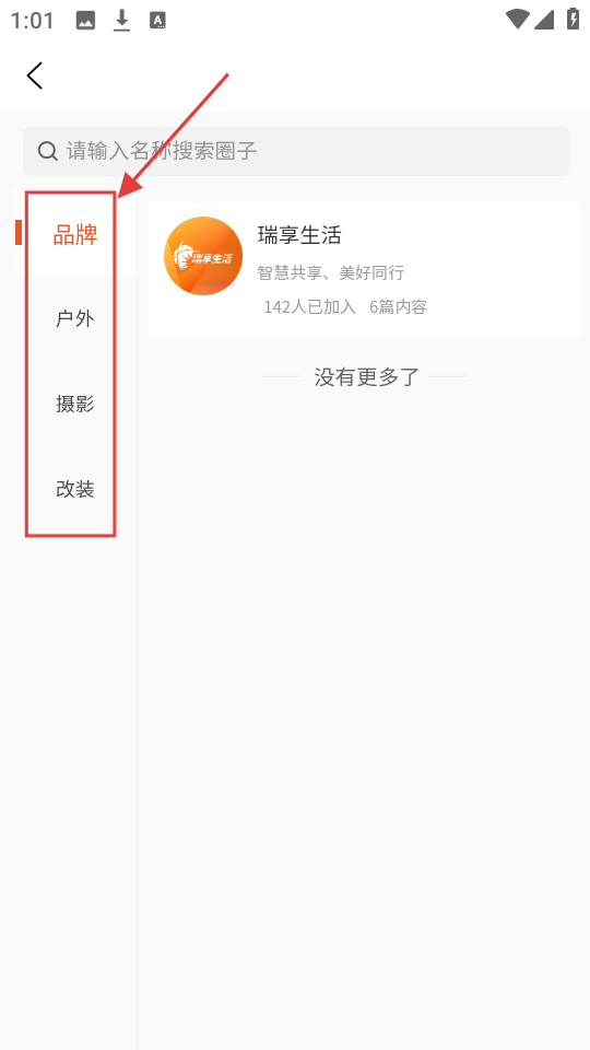 4、在圈子分类页,有【品牌】【户外】等分类,选分类,查看对应圈子,找到想加入的圈子。