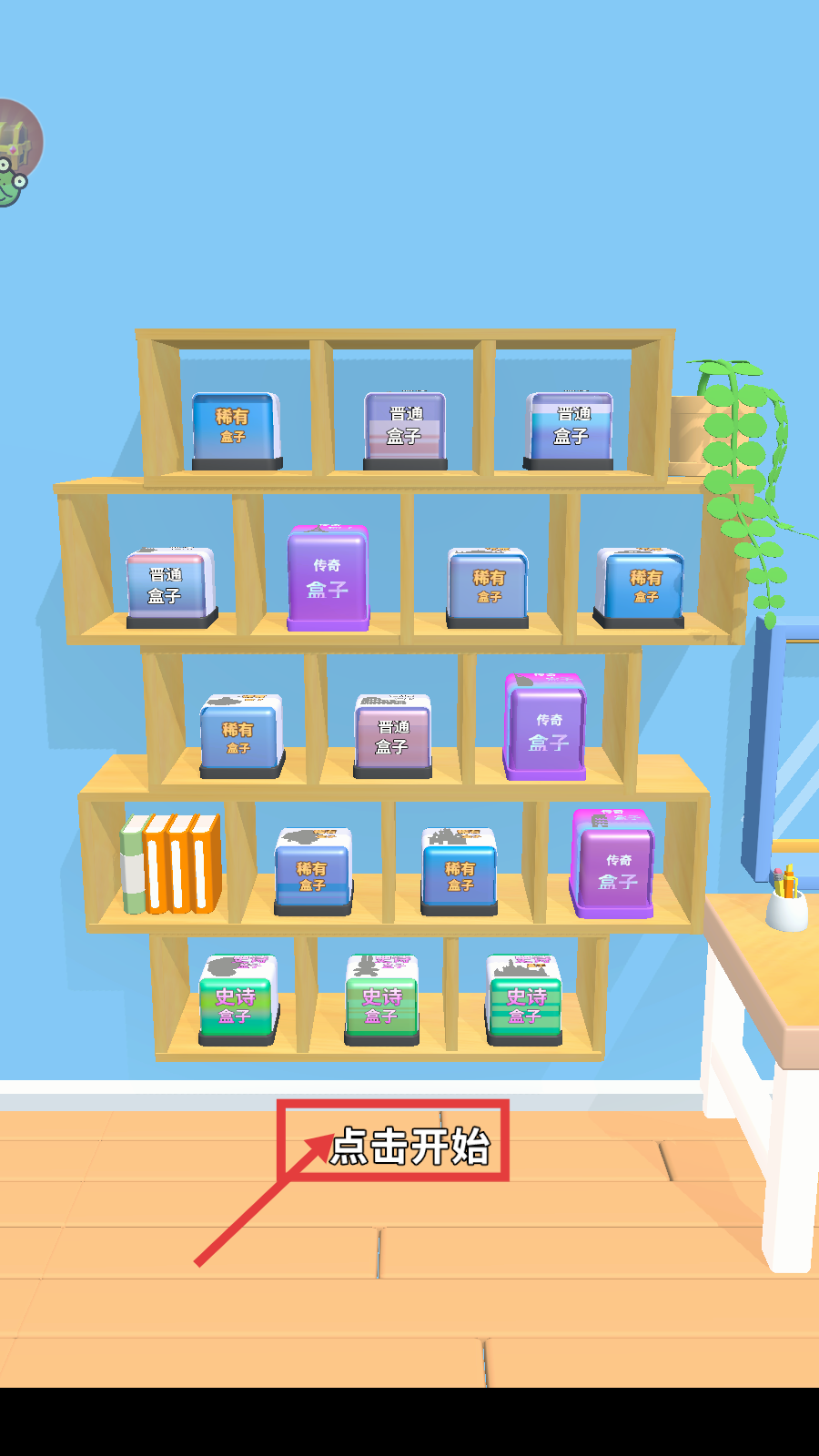 1、点击界面下方【点击开始】按钮,进入游戏,可看到书架上有【稀有盒子】【普通盒子】【传奇盒子】【史诗盒子】等。