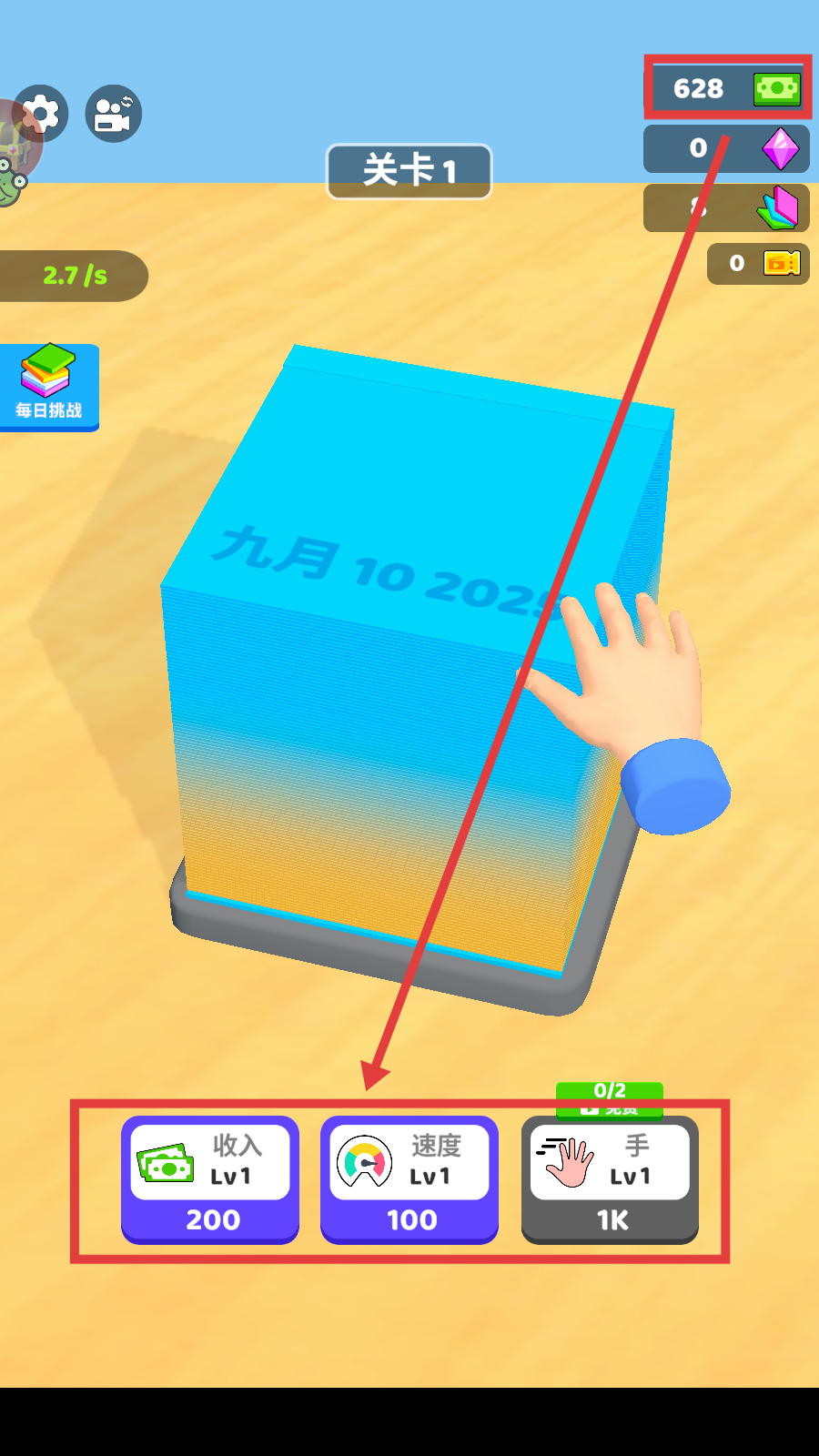 3、操作方块时,借助升级后的属性,让右上角金钱数值不断增加,同时观察操作带来的进度变化(如上方数字)。