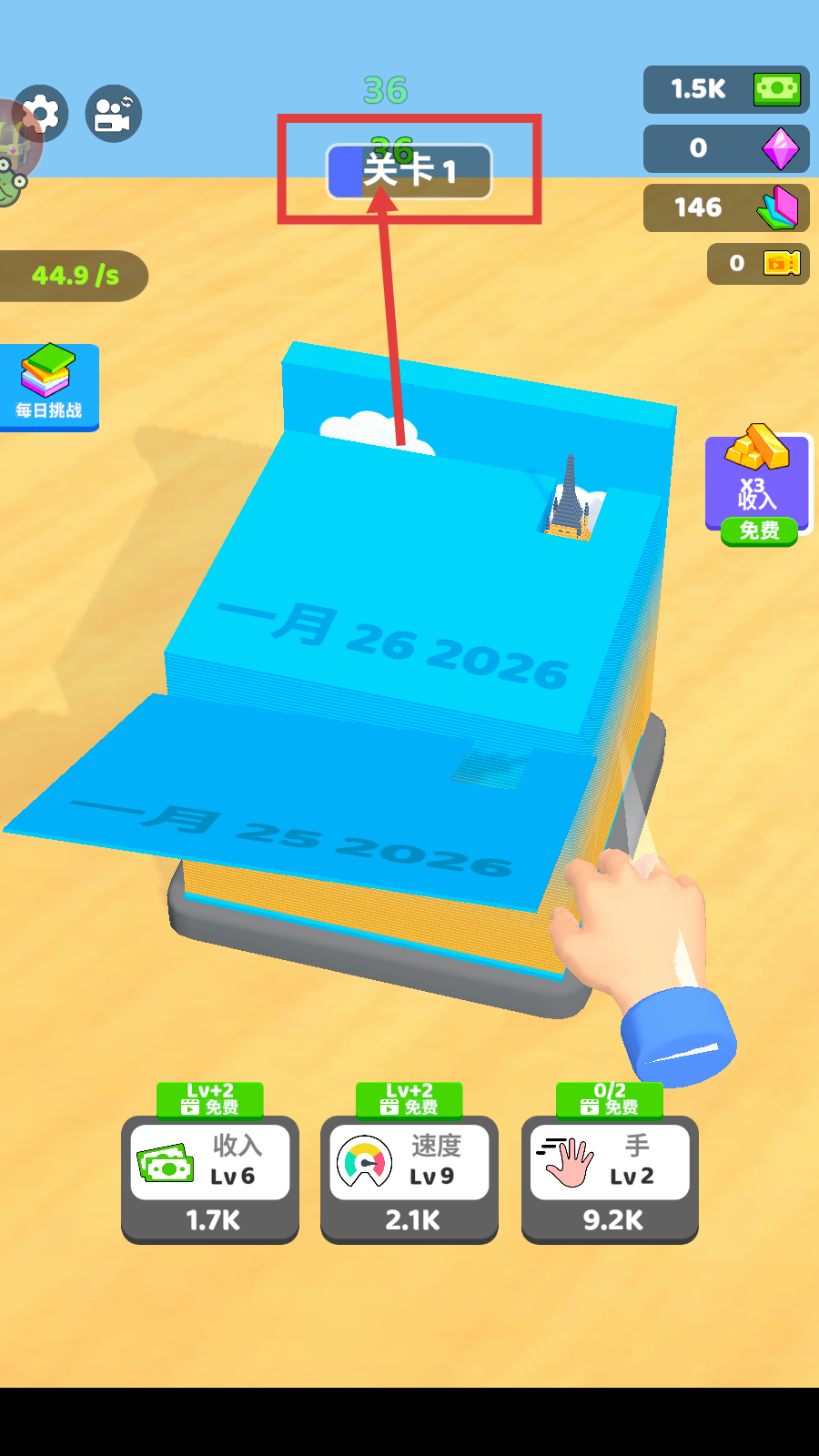 2、进入【关卡1】后,界面底部有【收入】【速度】【手】三个可升级选项,优先升级这些属性,提升后续操作效率。