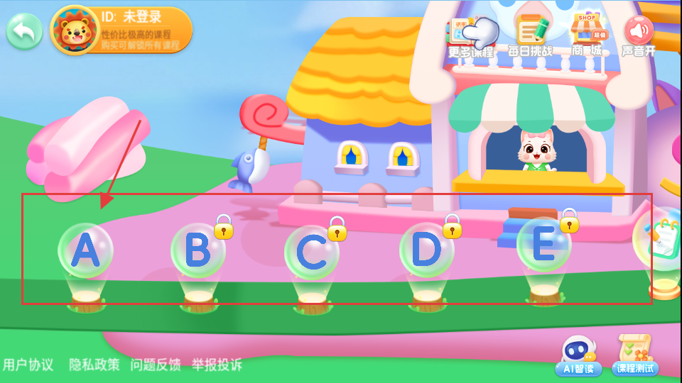 2、在字母选择页,有A、B等字母,A字母可直接学习,B及后续字母需解锁,先学A字母。