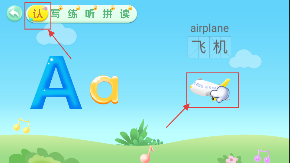 3、进入A字母学习页,在【认】模式下,认识大写A、小写a,还有对应英文单词【airplane】及飞机图案。