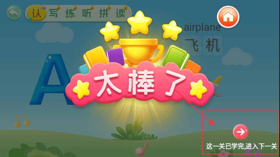 4、完成A字母学习后,会显示“太棒了”,点箭头按钮,进入下一关,继续英文字母学习。